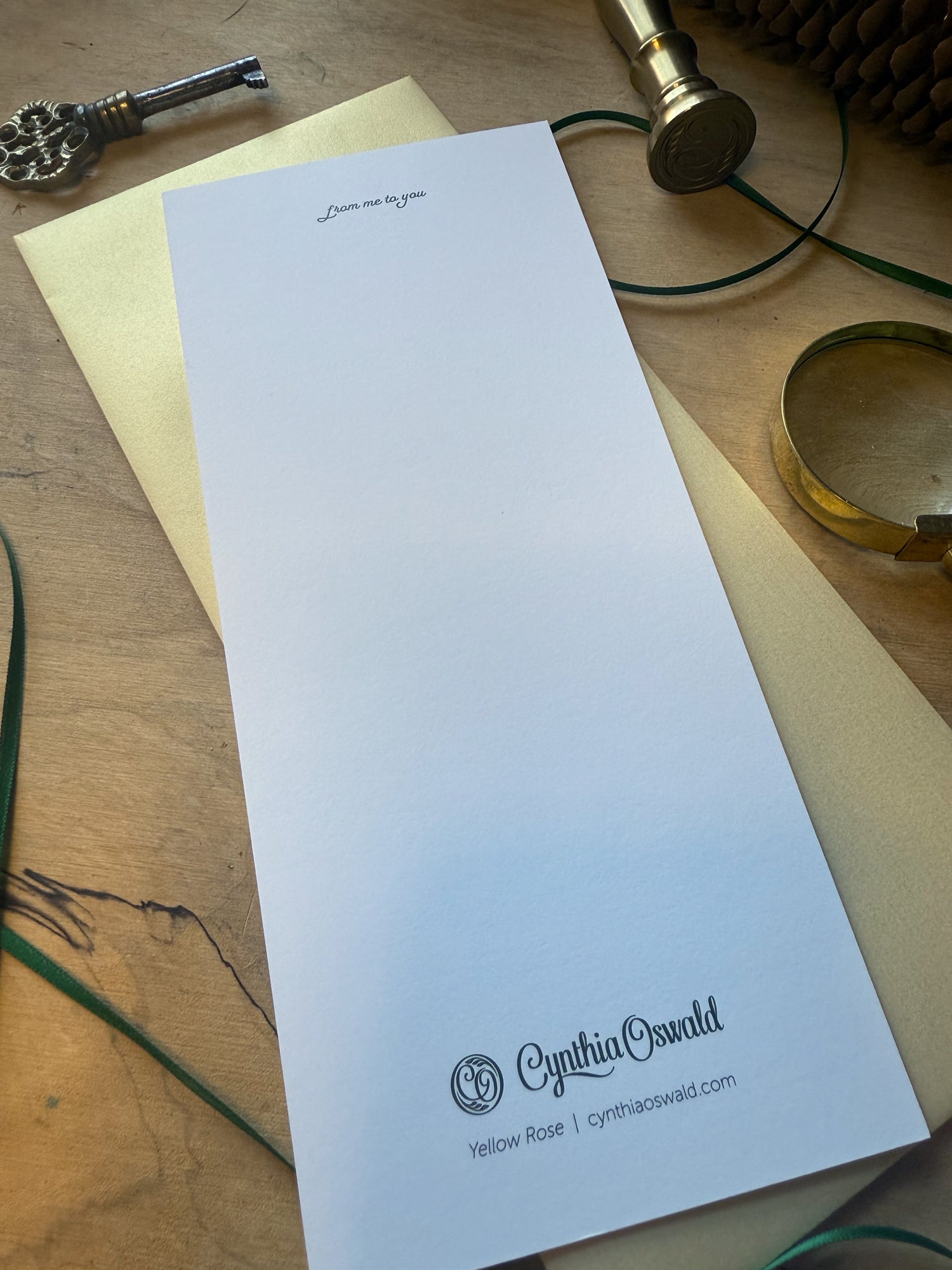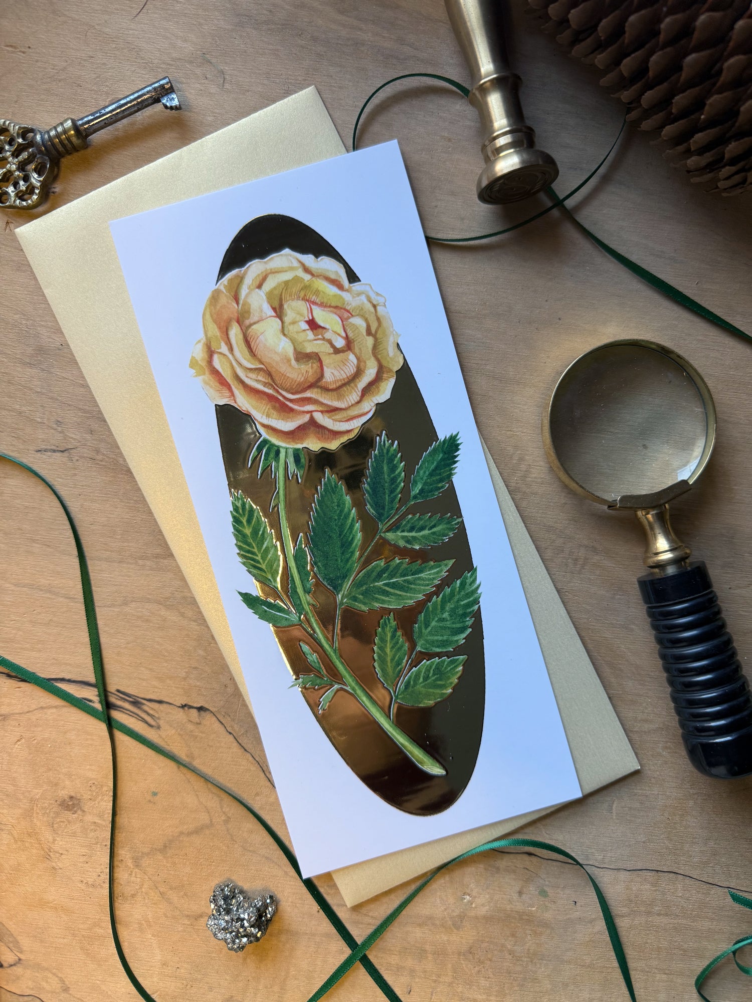 This elegant flat art card features Cynthia Oswald’s Yellow Rose watercolor, finished with a soft gold foil stamped halo for a warm, luminous touch. Printed on smooth, coated stock and paired with a gold No. 10 envelope.