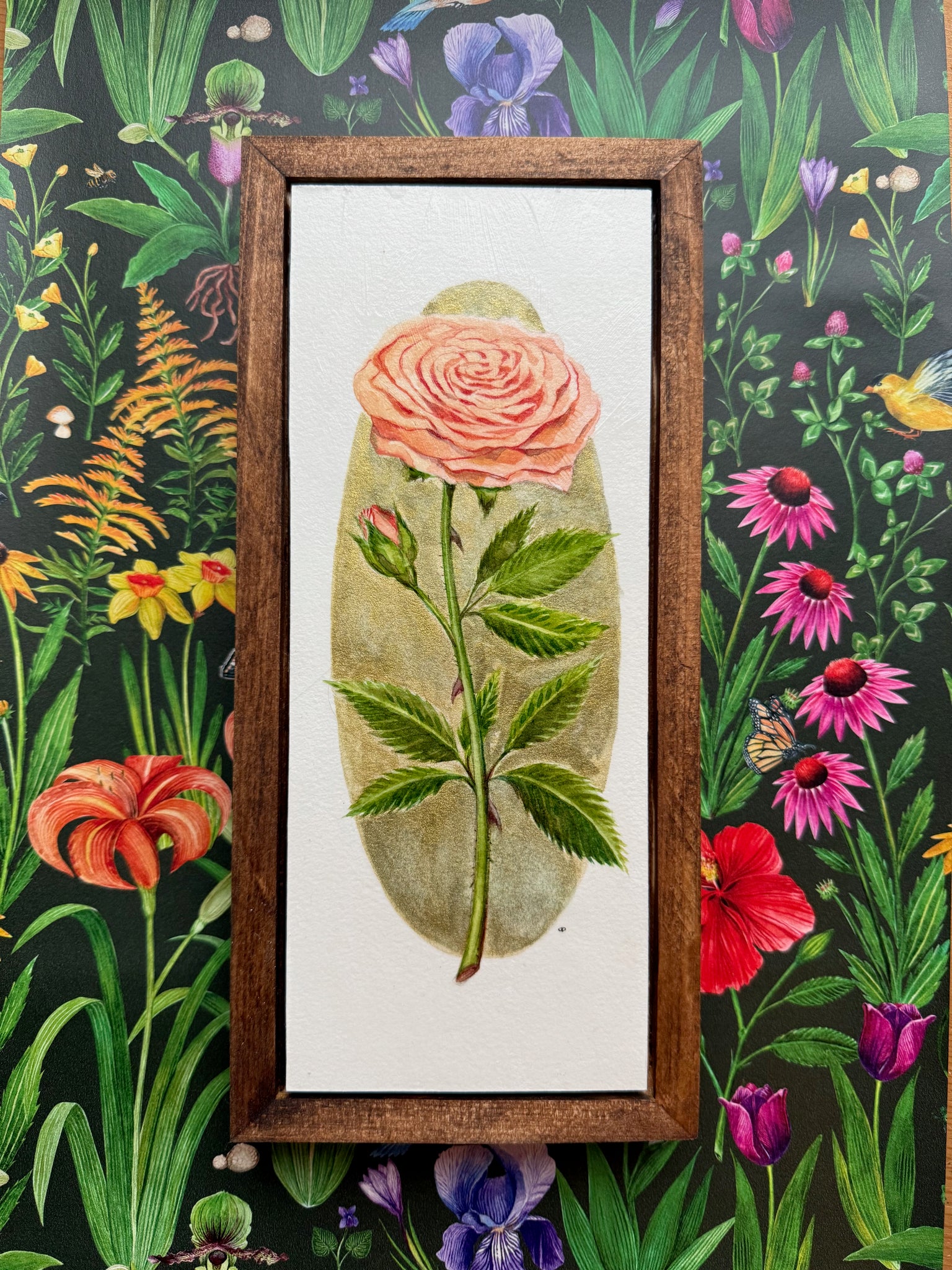 Part of my ongoing botanical studies, this piece celebrates the romance and fullness of a garden in bloom. The peach rose — often a symbol of gratitude and admiration — is rendered with delicate layers of watercolor, finished with archival UV protection and a clear acrylic coating, and haloed in metallic gold ink for a touch of luminous detail.