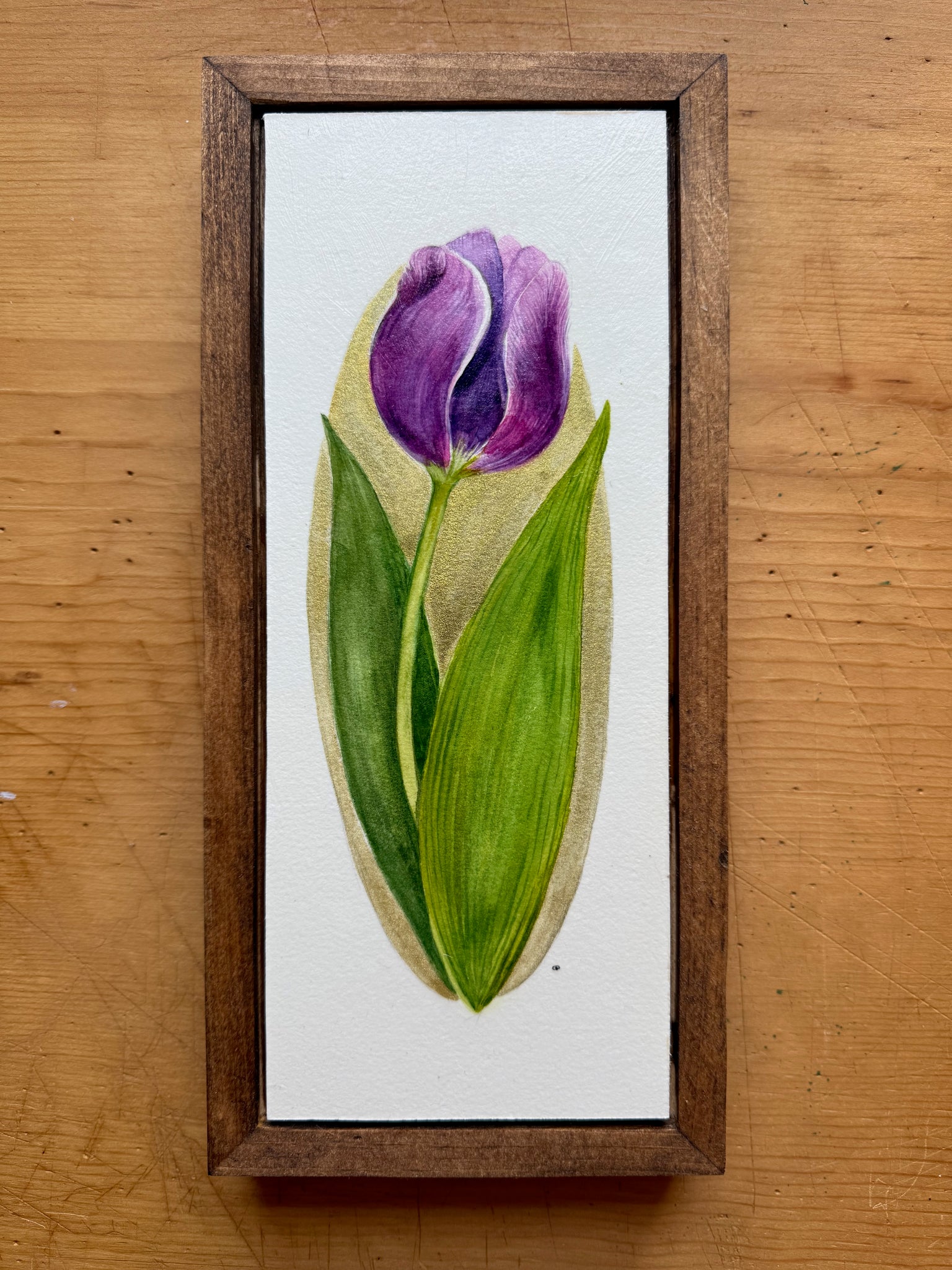 Bold yet graceful, this hand-painted purple tulip captures the elegance of one of spring’s most beloved blooms. Its rich violet petals and elongated form are set against soft green foliage and framed with a hand-painted gold halo for a subtle, luminous touch. This original watercolor is sealed and protected without glass, allowing you to experience the texture and depth of the artwork without glare.